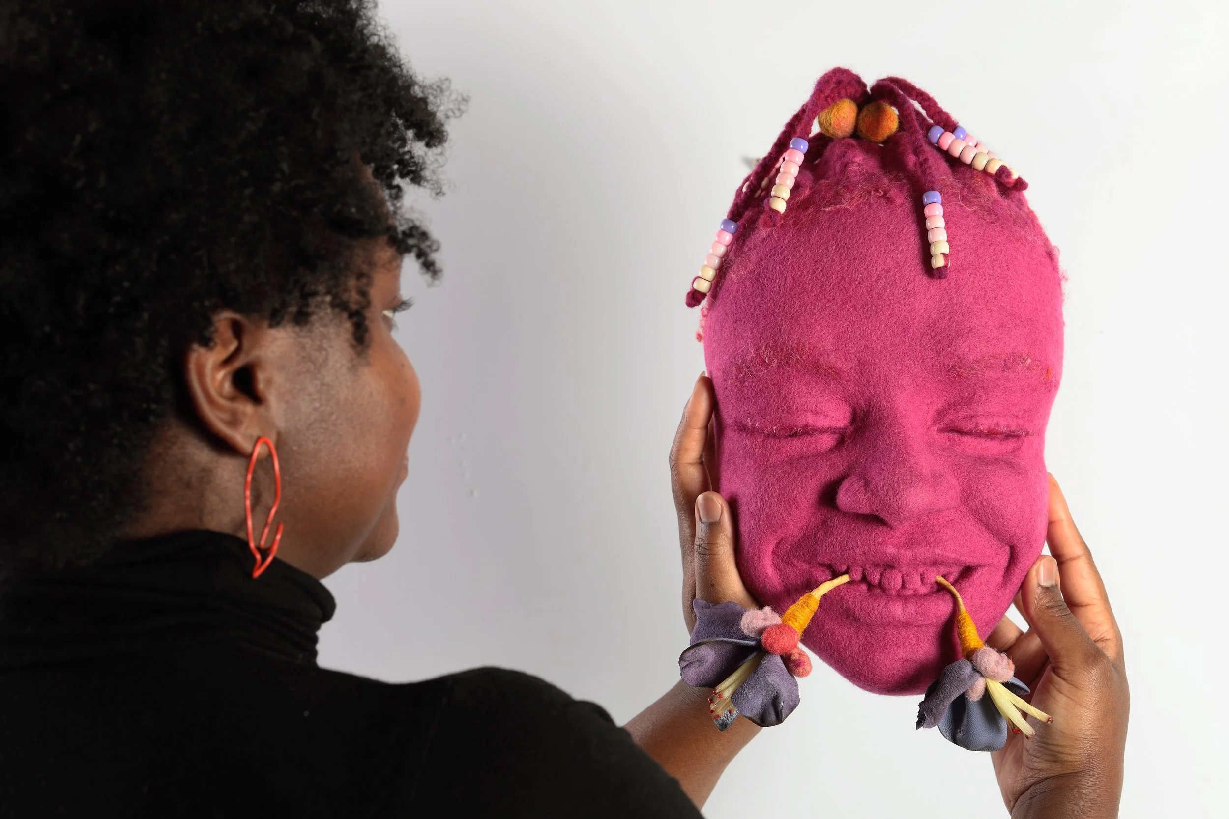 This sculpture is created to resemble someone coming through a wall, or substrate of some kind, and entering a space. This little girl becomes a declaration of our presence, our arrival. She carries these tattered flowers that reflect the difficulty of the journey during this lifetime. The layered journey of Black women and girls. Yet she smiles, and still holds her joy. And though the flowers hold a sense of heaviness, they become an offering.